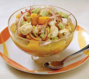 Un plato con un toque tropical, con corvina fresca marinada en zumo de lima, cebolla morada, cilantro y ají amarillo, acompañada de mango dulce y aguacate cremoso.